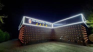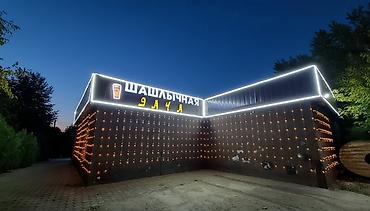 - Вывеска: «Шашлычная Дача», неоновая контурная подсветка по периметру, декоративная гирлянда на фасаде, значок пивного бокала