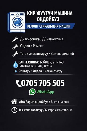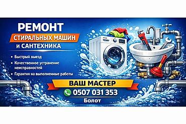 Ремонт стиральных машин в городе Бишкек. - Быстрое и недорогое устранение неисправностей любых марок и моделей. - Диагностика, замена и ремонт узлов: насос, ТЭН, подшипники, ремень, электронный мо...