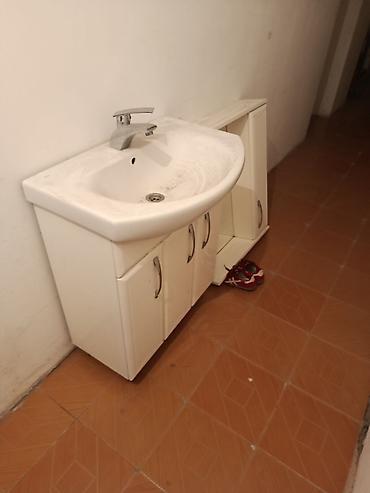 - Раковина керамическая, с отверстием под смеситель и переливом; установлен однорычажный смеситель.