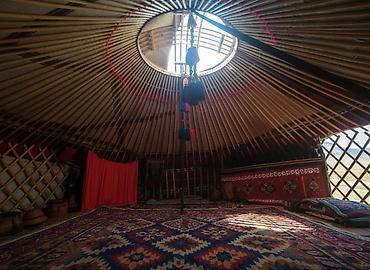 - Внутренний интерьер украшен национальными тесьмами, подвесами, текстилем; предусмотрено место для люстры/подвесного освещения в тюндюке.