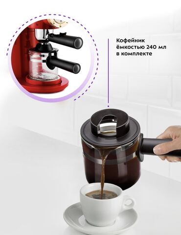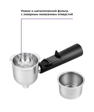 Комплектация мерная ложка-темпер; поддон для капель со съемной решеткой; кофейник с крышкой; крышка бойлера; фильтр, кофеварка, рожок, инструкция