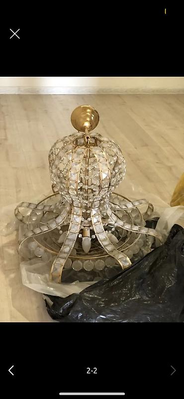 - Материалы: металлический каркас с золотистым покрытием; крупные прозрачные хрустальные/стеклянные элементы — шары, гранёные вставки, подвески.