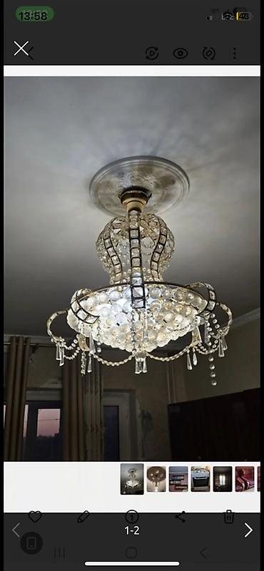 - Плафон/основание: широкое потолочное блюдо с декоративным узором, крепление к потолку через чашу и крюк.