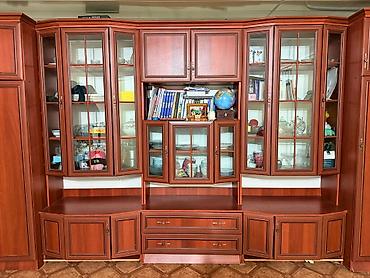 Классическая модульная мебельная стенка из ламинированного ДСП/МДФ под коричневое дерево (вишня/махагон) с фрезерованными фасадами и витринами из стекла.