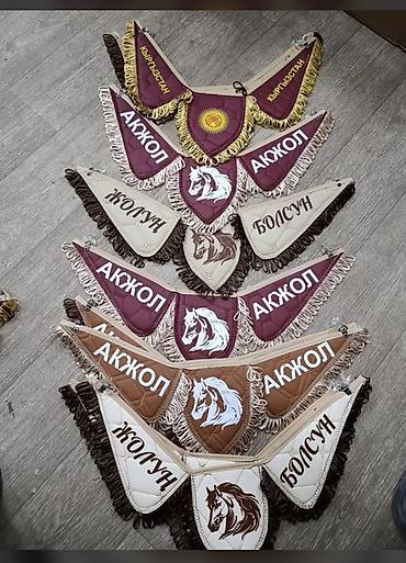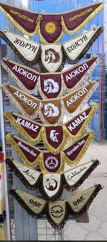 - Декор: вышивка/аппликации с надписями и эмблемами — «Кыргызстан», «Ак жол», «Жолун болсун», изображения коня, полумесяца, а также варианты с логотипами марок (KAMAZ, Mercedes-Benz, DAF и др.).