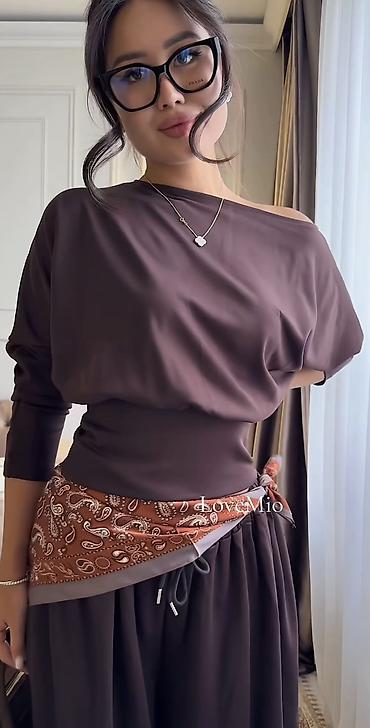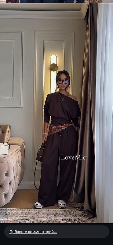 Женский комплект из двух предметов: свободные брюки + блуза - Цвет: теплый коричневый. - Крой: прямые широкие брюки полной длины; блуза с V-образным вырезом, длинными рукавами и мягкой линией тали...