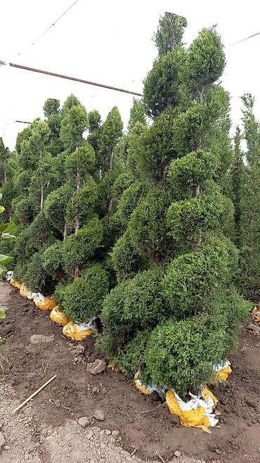 - Формованные туи/кипарисовики со спиральной стрижкой.
