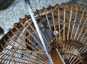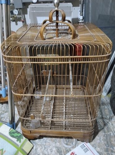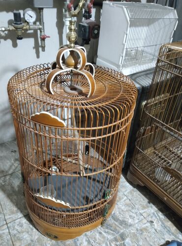 Клетка для птиц из бамбука, выполненная в традиционном стиле. Имеет округлую форму и тонкие прутья, создающие достаточно пространства для обитания птицы. На дне клетки расположена выдвижная секция для удобства уборки. В верхней части клетки предусмотрены крепления для подвешивания, а также декоративные элементы, добавляющие ей эстетическую привлекательность. Подходит для различных мелких и средних птиц.
