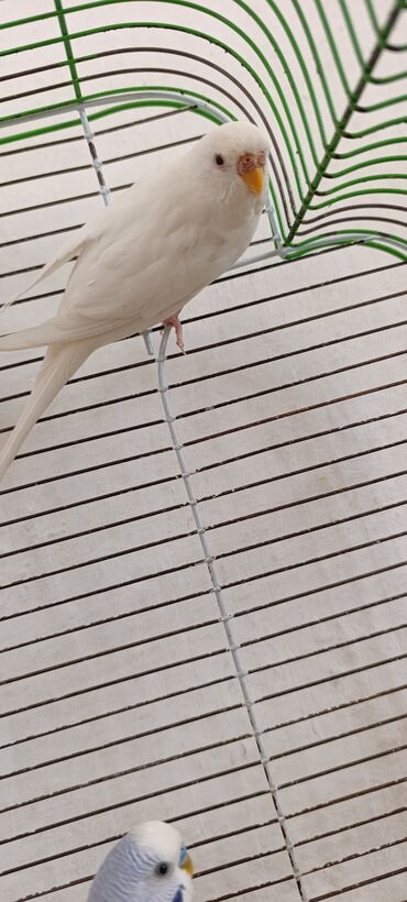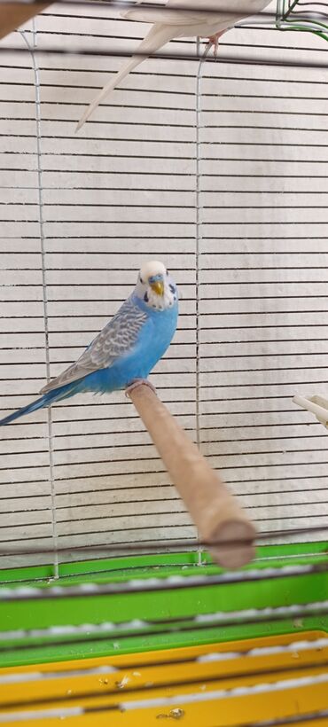 Волнистый попугай в комплекте с клеткой и аксессуарами. Состав: - Волнистый попугай окраса бело-голубой с серыми маховыми отметинами. - Просторная металлическая клетка золотистого цвета с фигурным...