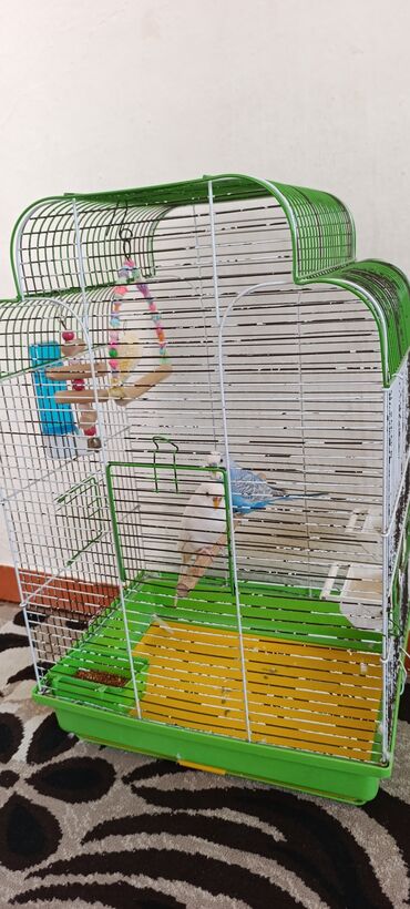 Волнистые попугаи с полной домашней экипировкой клетки. Комплектация: - Просторная клетка с горизонтальными прутьями и удобными дверцами. - Деревянные жёрдочки разного диаметра. - Игрушки и развив...