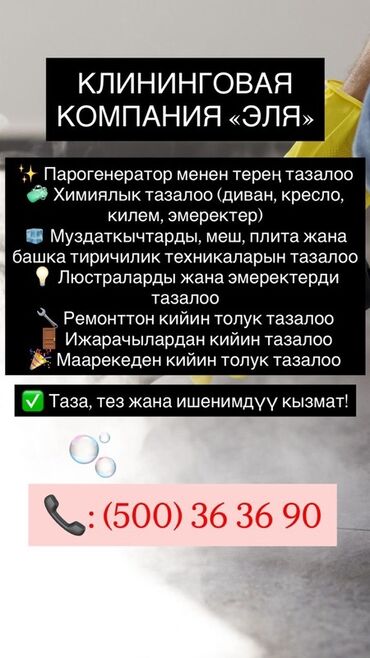 Клиннинговая компания «Эля» предлагает комплексные услуги по уборке помещений. В перечень услуг входит глубокая чистка парогенератором, а также химическая чистка мягкой мебели, такой как диваны и кресла, и ковров. Компания также предоставляет услуги по очистке холодильников, плит и другой бытовой техники, а также люстр. Возможна полная уборка после ремонта, от арендаторов и после мероприятий. Предлагается чистый, быстрый и надежный сервис.