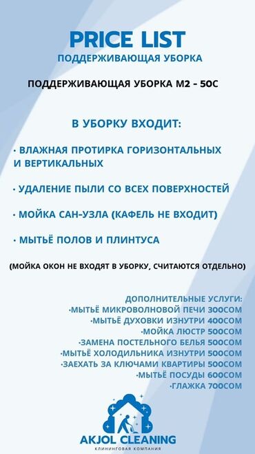 - Поддерживающая уборка (50 с/м²): влажная протирка горизонтальных и вертикальных поверхностей, удаление пыли со всех поверхностей, уборка санузла (без мытья кафеля), мытьё полов и плинтусов. Мытьё окон не входит и считается отдельно.