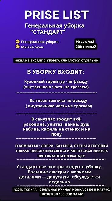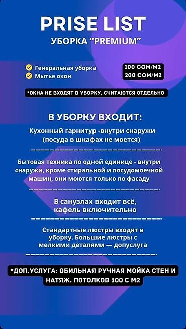 Тип помещения: Дома, Кафе, магазины, Квартиры, Офисы, Подвал, погреб, Подъезды, Другое Тип уборки: Генеральная уборка, Мойка окон,
