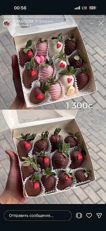 - Коробка с клубникой в тёмном/белом/розовом шоколаде — 1300 с.