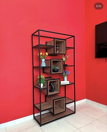 - Конструкция: открытный стеллаж с асимметричными шестиугольными секциями; разная высота и глубина ниш для фигурок, книг, ваз, растений.