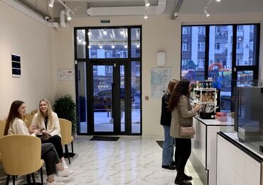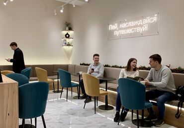- Просторный зал с мягкими диванами и креслами, отдельные столики для работы и встреч.