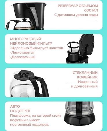Компактная кофемашина для быстрого приготовления фильтр-кофе дома или в офисе. Подходит для молотого кофе; равномерная экстракция, капля-стоп, прозрачная колба для контроля объема. 24 месяца гарантии (указано на коробке). Unique design / Easy operation / 6 cups / Level calibration.