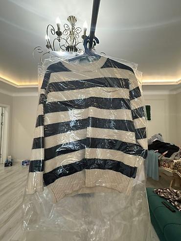2) Вязаный джемпер в широкую горизонтальную полоску темно-синего и молочного цветов. Круглый вырез, фактурная вязка, плотные рубчатые манжеты и низ.