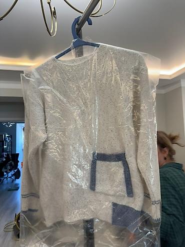 4) Светлый (молочно-серый меланж) вязаный свитер с синей отделкой: контрастный накладной карман спереди, синяя кайма по низу и на рукаве, круглый вырез, рубчатые манжеты и низ.