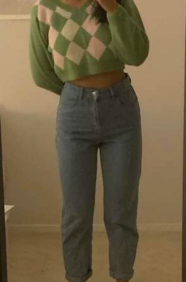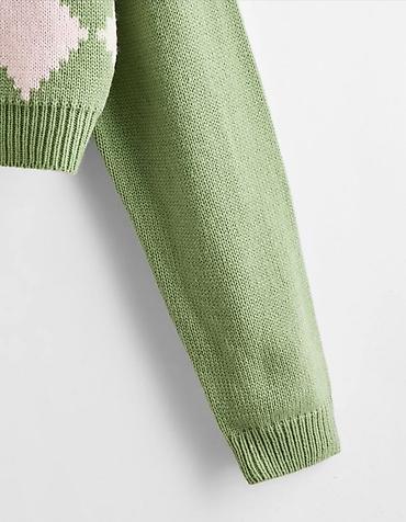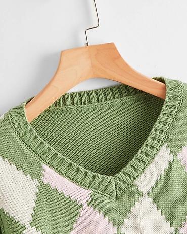 Очень милый, тёплый свитер. Трендовый в этом году ромбик и Светло зелёный цвет.