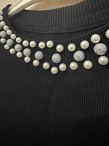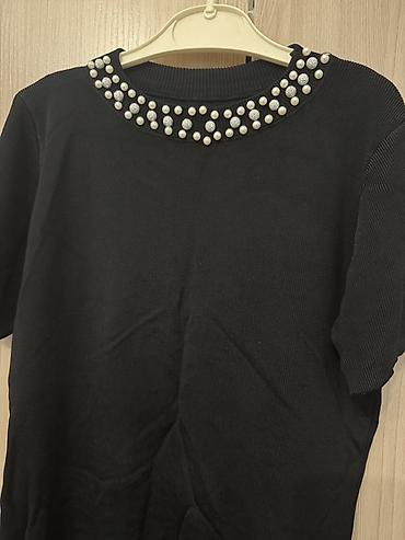 Черная футболка круглым вырезом. Главный акцент — украшенный ворот: двойной ряд крупного декора из жемчужных бусин и блестящих сфер, создающих эффект колье. Универсальная длина, прямой крой. Идеально для повседневных образов и вечера: сочетается с джинсами, юбками и классическими брюками, не требует дополнительного украшения на шее. Цвет: черный. Декор: перламутровые и серебристые бусины. Рукав: короткий. Вырез: круглый. Материал: трикотаж.