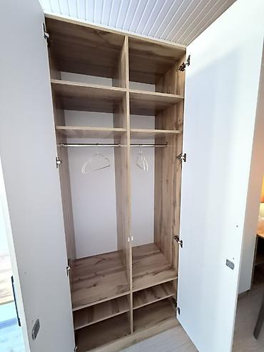 - Большие шкафы‑локеры на каждого жильца с секциями, полками и штангами для вешалок.