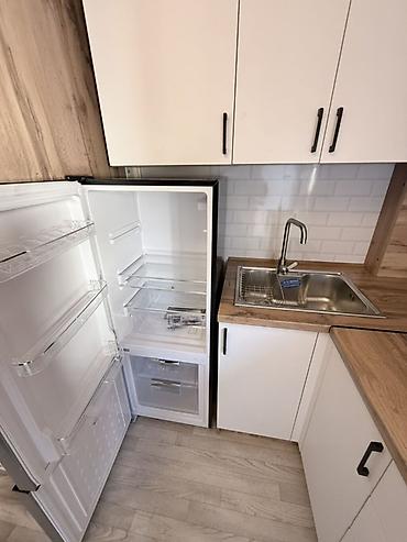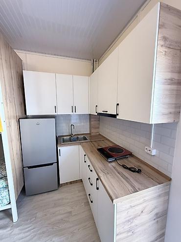 - Просторная рабочая зона вдоль стены: длинная столешница, табуреты.