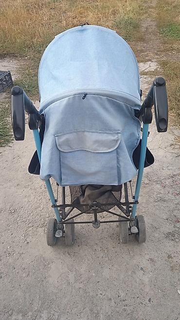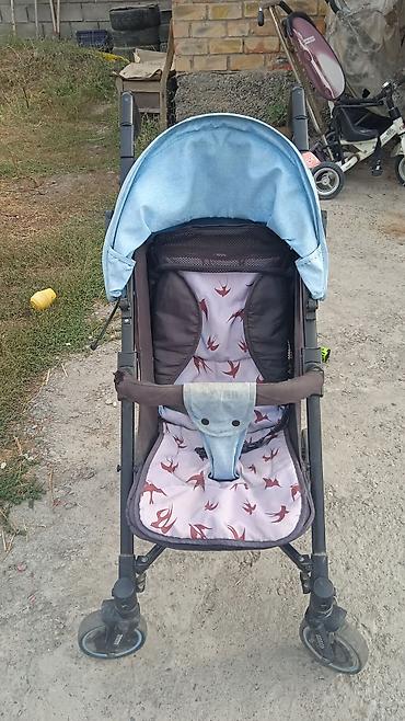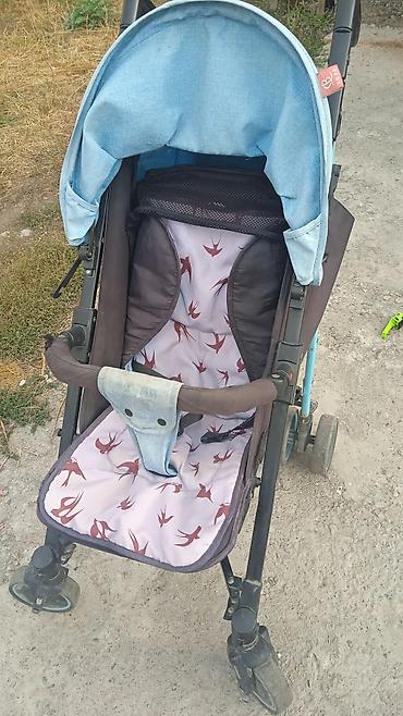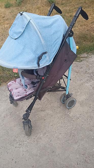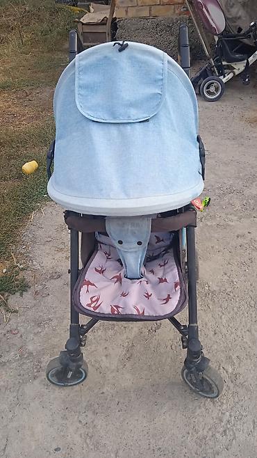 Отличный вариант для повседневных прогулок: маневренная, складывается одной рукой, легко помещается в багажник. Цвета: светло-голубой капюшон, коричневая рама/боковины, серая обивка с узором.