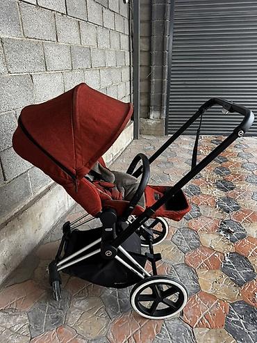 Прогулочная коляска Cybex (линейка Priam) в стильном цвете терракота с серым внутренним текстилем.