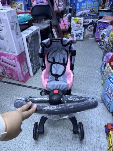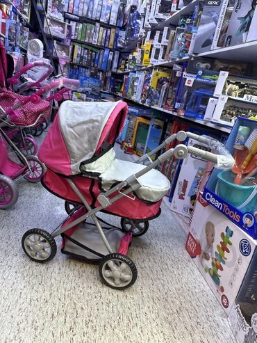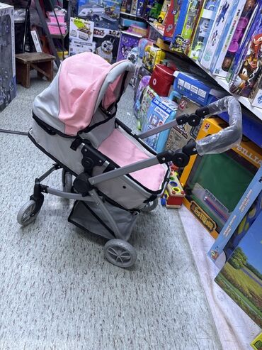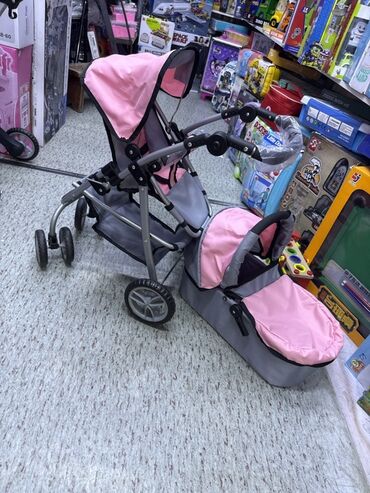 Детская коляска для кукол. - Тип: игрушечная прогулочная/люлька для кукол. - Цвет: розовый с белым и серым. - Каркас: металлические трубки, пластиковые соединители. - Ручка: цельная, с мягкой накл...