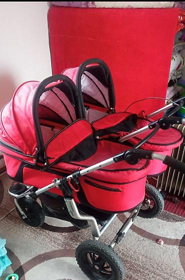 Коляска для двойни (близнецов) бок-о-бок. Основные особенности: - Два полноразмерных люльки-корзины рядом, каждая с отдельным капюшоном и ручкой для переноски. - Шасси с четырьмя большими надувным...