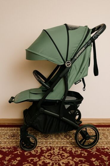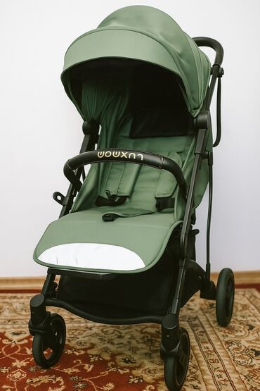 ЧерныйКоляска Luxmom оливкового цвета с черной рамой. Имеет регулируемый капюшон, сиденье с ремнями безопасности и бампером, а также корзину для покупок внизу. Коляска легко складывается для удобства хранения и транспортировки. Подходит для прогулок с ребенком на свежем воздухе. В идеальном состоянии. В комплекте чехол, противомоскитная накидка.