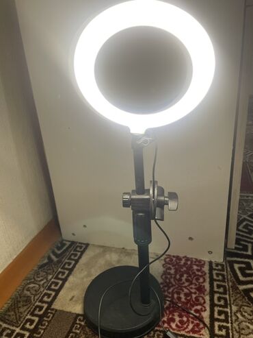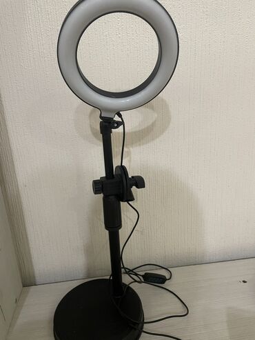 Комплект: кольцевая лампа, настольная стойка с утяжелённым основанием, кабель USB с пультом, держатель для телефона.