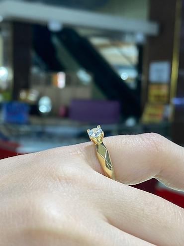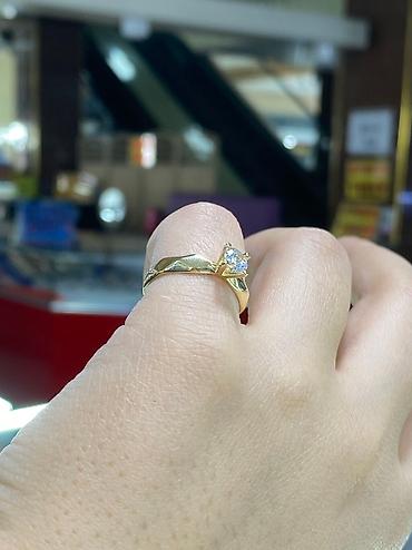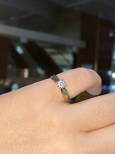 Кольцо из кыргызского золота 375 пробы. - Масса: 1,46 г - Размер: 18 - Вставка: прозрачный круглый камень в четырёхкрапановом креплении (солитер) - Дизайн: гладкая полированная шинка с раздвоением...