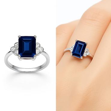 Роскошное кольцо с глубоким синим камнем изящной огранки, дополненное сияющими прозрачными вставками одинакового размера, создаёт гармоничный и утончённый образ. Чёткие линии и блеск камней подчёркивают статус и вкус своей обладательницы.