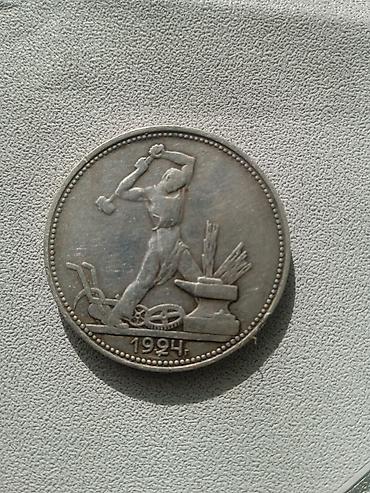 - Полтинник РСФСР 1924 года: «Один полтинник», номинал 50 копеек. На аверсе — герб с венком колосьев и надпись «Пролетарии всех стран, соединяйтесь!». На реверсе — кузнец у наковальни, год «1924». Серебро (стандарт для этого типа — 900 проба, диаметр около 26,7 мм, вес около 10 г; надписи и оформление соответствуют типу).