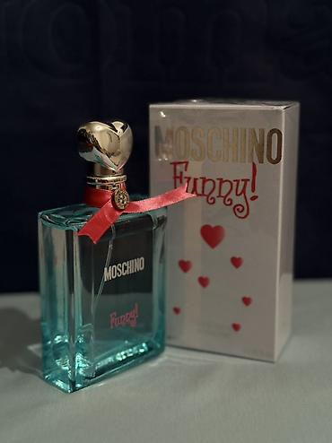 - Moschino Funny! — бирюзовый флакон с серебристой крышкой-сердцем и красной лентой; коробка с золотистым логотипом и красными сердечками.