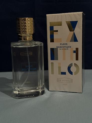 - Ex Nihilo Fleur Narcotique, Eau de Parfum — прозрачный граненный флакон с золотистой фактурной крышкой; коробка белая с графичным логотипом.
