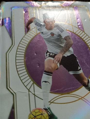 - Карта с футболистом: изображение игрока в белой форме с эмблемой Valencia CF, динамичный кадр ведения мяча; декоративная фиолетово‑золотая рамка, элементы тиснения.