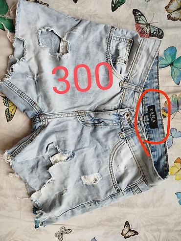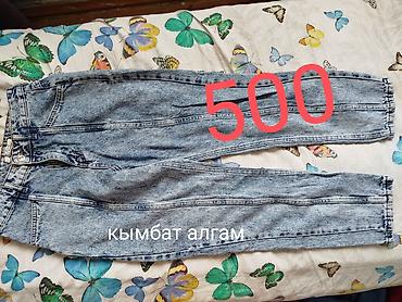 4) Джинсы женские/подростковые, светло‑синяя варенка. Высокая посадка, защипы/строчки спереди, пояс на пуговице и молнии, зауженные книзу резинки. На фото: «кымбат алган». Цена на фото: 500.
