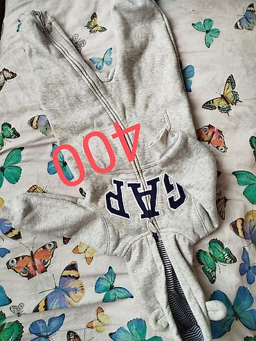 2) Комбинезон‑кенгуру GAP для новорожденных, серый меланж. Молния по центру, капюшон с ушками, мягкая хлопковая подкладка в полоску, манжеты на рукавах и ножках. Цена на фото: 400.