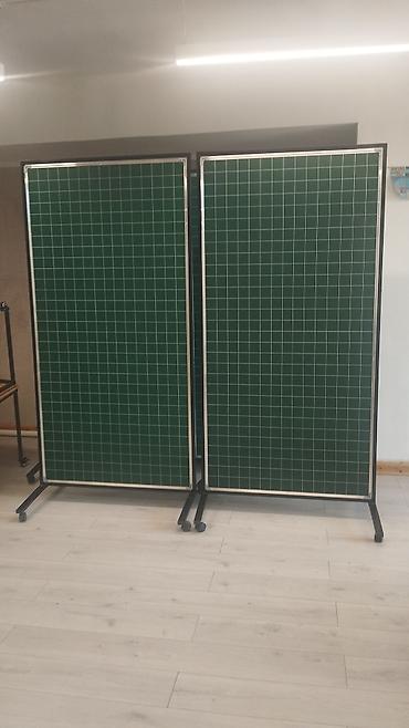 - Три рабочие поверхности: центральная зелёная мелованная и боковые створки; одна из створок — белая маркерная (магнитная). Есть модели с разметкой в клетку и одностворчатые мелованные доски.