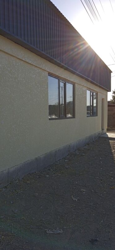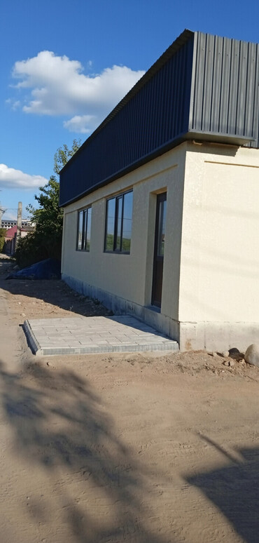 - Прямоугольное строение с монолитным цоколем и оштукатуренными фасадами светлого цвета.