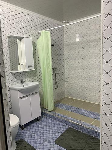 - Отдельный санузел с душевой зоной, раковиной с тумбой, зеркальным шкафчиком, унитазом и ковриками.