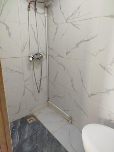 - Санузел с душевой зоной: керамическая плитка «под мрамор», трап, смеситель с лейкой, унитаз.