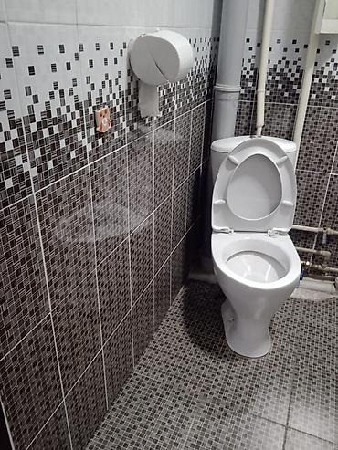 - Санузел в кафеле, унитаз, настенный держатель для бумаги.