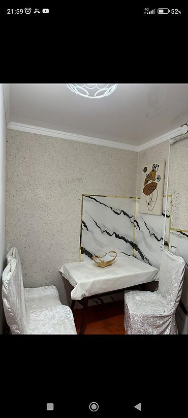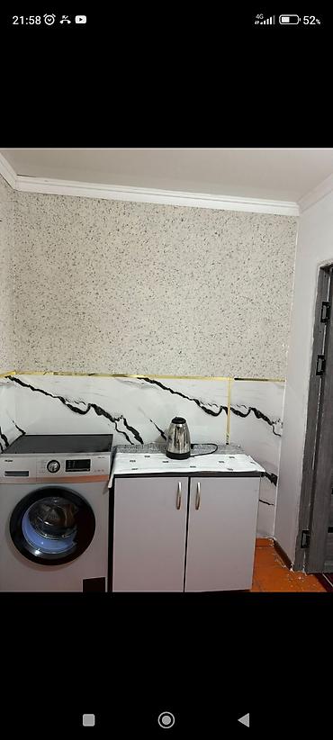 - Небольшая кухня-уголок: стол, два стула с чехлами, шкаф-тумба, электрический чайник, стиральная машина Haier. Фартук под мрамор с латунными вставками, розетки в удобных местах.