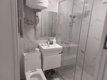 - Керамогранит с мраморной фактурой, стеклянные перегородки.