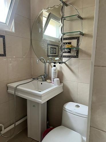 - Санузел: унитаз, умывальник на пьедестале с смесителем и гибким шлангом, настенное зеркало со стеклянными полочками, керамическая плитка на стенах, окно для естественного освещения и проветривания.