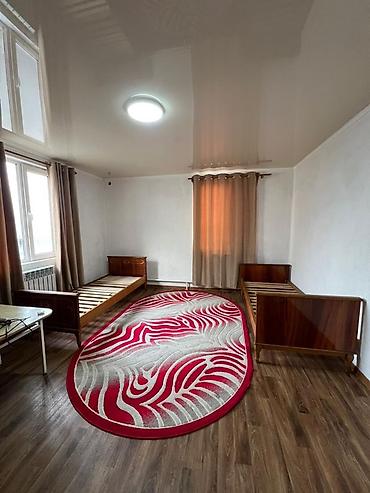 - Просторная светлая комната с двумя односпальными деревянными кроватями-основаниями, большим овальным ковром, шторами на окнах и потолочным светильником. Напольное покрытие — ламинат.
